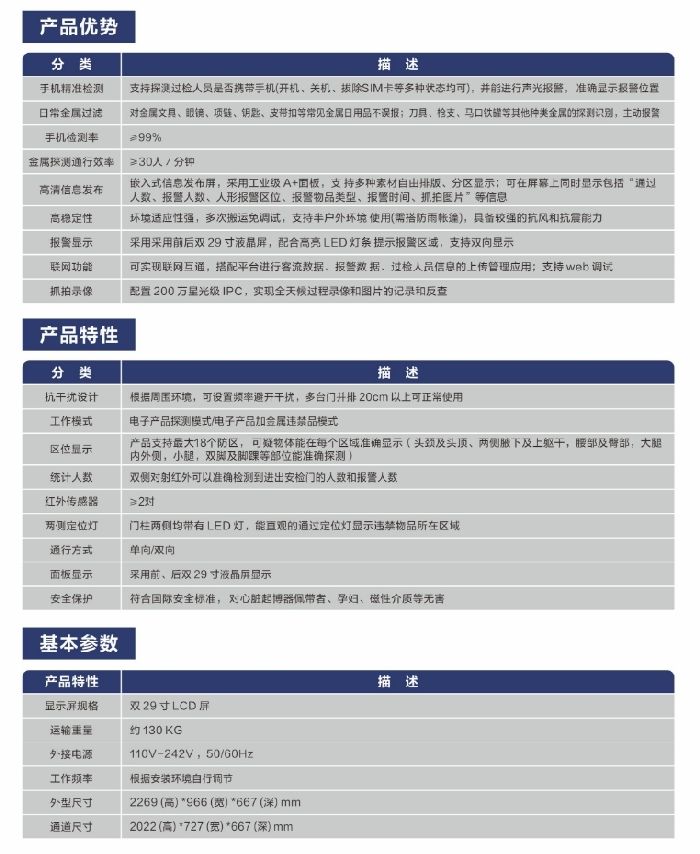 ZA-AM1629手機(jī)檢測(cè)門,可對(duì)手機(jī)進(jìn)行分類檢測(cè)和聲光報(bào)警,并排除鑰匙、皮帶扣、眼鏡、首飾、各類文具等日常金屬用品不誤報(bào);前后均采用29寸信息發(fā)布顯示屏,可實(shí)現(xiàn)圖片、音頻、視頻、字幕、實(shí)時(shí)畫面等不同素材的靈活播故;支持過(guò)程錄像和抓拍,實(shí)現(xiàn)歷史記錄反查;并針對(duì)性加強(qiáng)抗鳳和震動(dòng)等干擾的能力。
