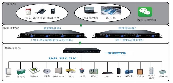 機(jī)房動(dòng)環(huán)綜合監(jiān)管系統(tǒng)是一個(gè)綜合應(yīng)用計(jì)算機(jī)網(wǎng)絡(luò)、物聯(lián)網(wǎng)、云計(jì)算、無線通信、自動(dòng)控制等技術(shù)構(gòu)成的管理系統(tǒng),以計(jì)算機(jī)技術(shù)為基礎(chǔ)、基于集中管理監(jiān)控模式的自動(dòng)化、智能化和高效率的技術(shù)手段針對機(jī)房的動(dòng)力、環(huán)境、消防、網(wǎng)絡(luò)、安防等系統(tǒng)的監(jiān)控,實(shí)現(xiàn)遠(yuǎn)程運(yùn)維。